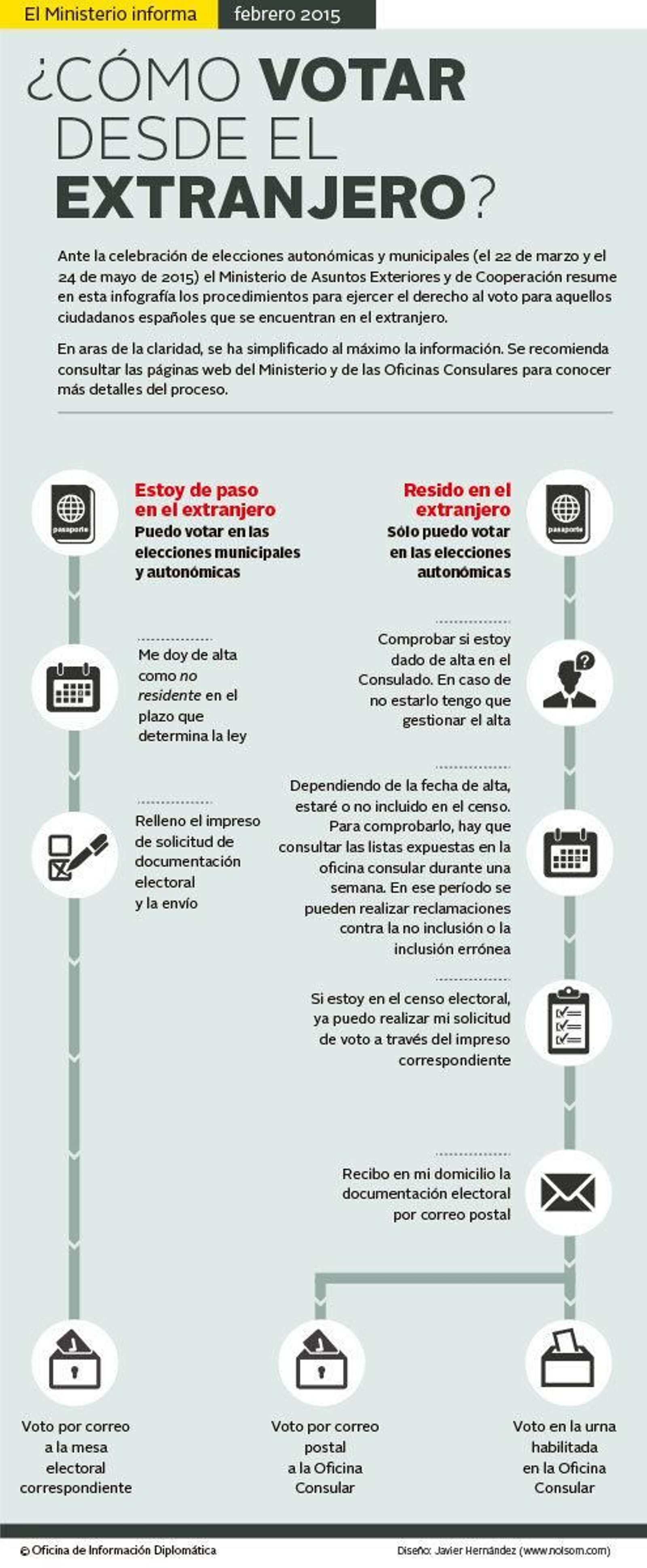 El Ministerio de Asuntos Exteriores y de Cooperación ha elaborado una infografía en su sitio web (www.exteriores.gob.es) para explicar a los ciudadanos españoles qué pasos tienen que dar si van a votar desde el extranjero en las próximas elecciones municipales y autonómicas, que se celebrarán en los meses de marzo y mayo.