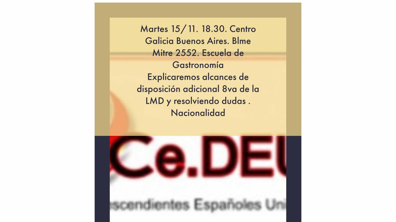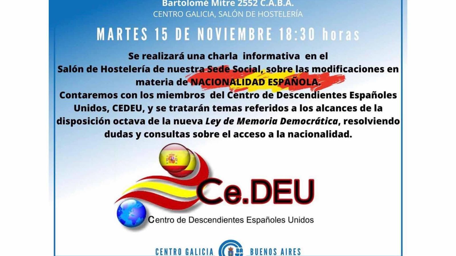 Entretanto, asociaciones que han luchado sin desmayo por el reconocimiento del derecho al acceso a la nacionalidad para los descendientes de emigrantes españoles, como es el caso de Ce.DEU en Argentina, (aunque tiene representantes delegados en otros países del Cono Sur, como Uruguay), al recibir tantas consultas, ya que la interpretación de la ley no resulta sencilla, y menos después de haber tenido que esperar a la interpretación jurídica de la Disposición Adicional 8ª, dado que inicialmente quedaba en el aire la posibilidad de que los derechos que sí se habían reconocido en la anterior ley, la de Memoria Histórica de 2007 no fueran reconocidas en la Ley de Memoria Democrática, han organizado sesiones para explicar al detalle, y atender consultas, como la que celebrarán la próxima semana en la sede de la Casa de Galicia de Buenos Aires.