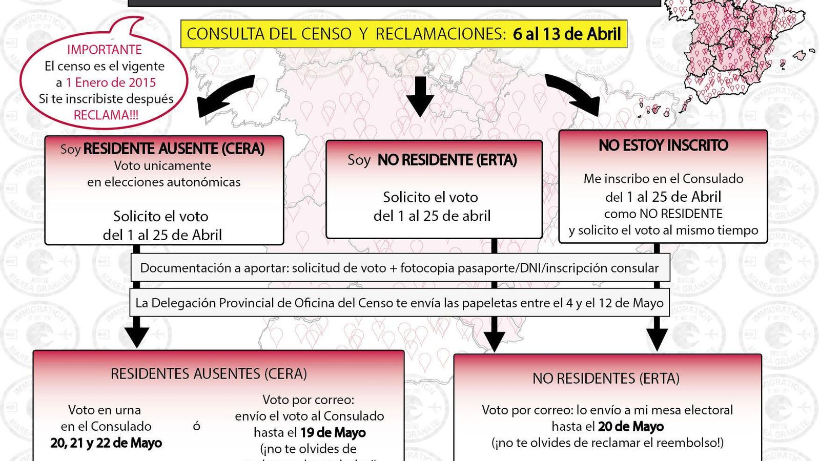 "Un ciudadano español en Londres nos cuenta cómo se le ha denegado el registro como residente temporal por haberse registrado en el consulado de Londres de manera circunstancial hace años cuando estaba de vacaciones y perdió el DNI. Esta persona tan sólo se queda unos meses en la ciudad por lo que su perfil no se ajusta al de residente permanente. La respuesta del consulado es tajante: o te registras en el CERA o vuelves a España a votar", señala el comunicado oficial de Marea Granate.