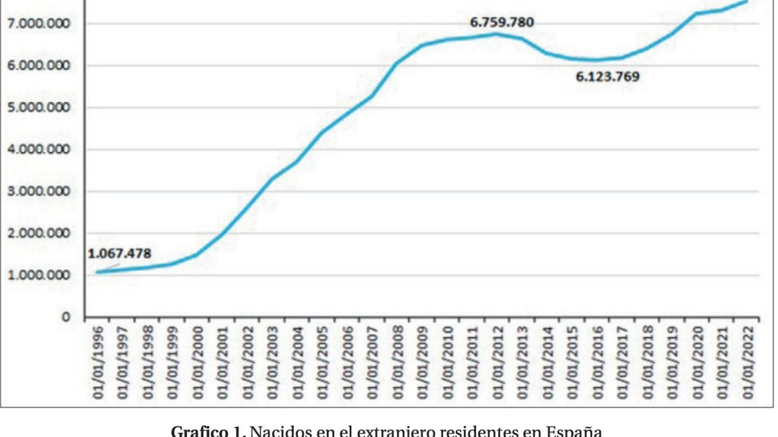 España ha sido durante siglos un país fundamentalmente de emigrantes, bien a la Europa o América Latina, sin embargo, desde hace 40 años, se ha convertido en un país receptor. Y es que tal y como se se señala en el informe "empezó a aumentar la población foránea en España, y de forma muy especial, a partir de la segunda mitad de los años 90, pasando de un millón y pico extranjeros nativos residiendo en España en 1996 –casi 900.000 más que 20 años antes– a unos 7,5 millones a comienzos de 2022, a los que hay que sumar en torno a dos millones de hijos suyos, nacidos en España desde mediados de los 90".