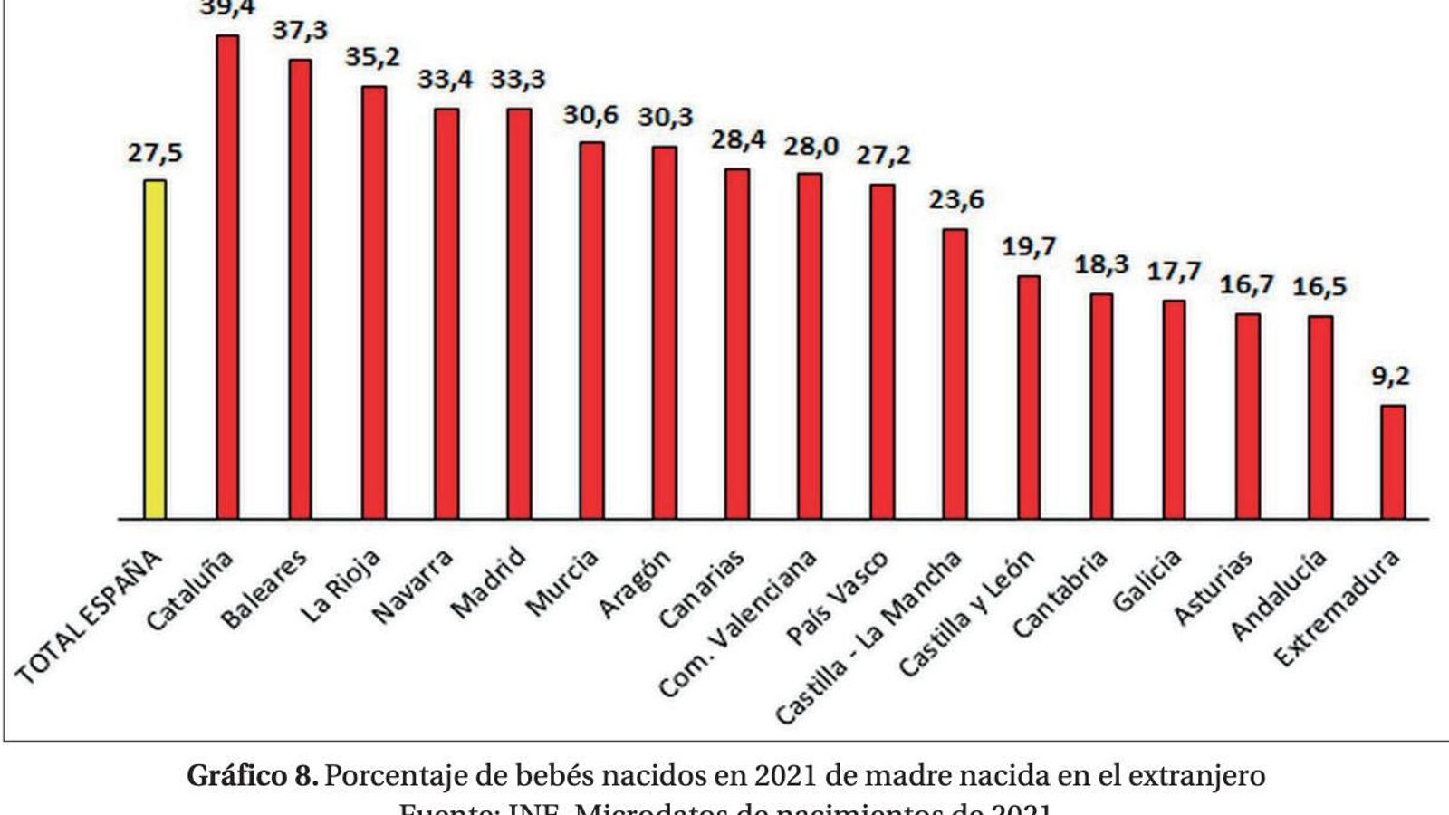 Si se tiene en cuenta al padre y a la madre, ese mismo año, el 32,4% de los niños alumbrados en nuestro país, tenía al menos un progenitor de origen extranjero. Por comunidades autónomas, la cifra se dispara en Cataluña. Casi el 51% serían residentes en la provincia de Gerona (50,9), seguida por Lérida (45,2%), Barcelona (45,1%), Baleares (45,0%), Tarragona (44,8%), Almería (42,4%), Guadalajara (39,6%), La Rioja (39,4%), Madrid (39,0%), Álava (38,6%), Navarra (37,9%), Alicante (36,7%), Santa Cruz de Tenerife (36,3%), Zaragoza (34,9%), Soria (34,3%), Murcia (34,2%), Huesca (33,9%), Las Palmas (33,7%), Castellón (33,2%), Cuenca (33,1%), Segovia (32,3%), Orense (31,6%), Teruel (31,4%), Guipúzcoa (30,8%), Valencia (30,7%), Toledo (30,3%) y Málaga (30,0%).