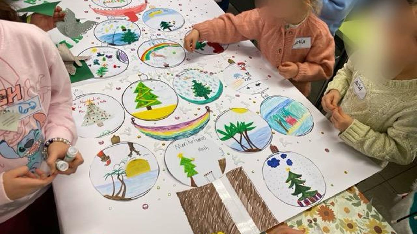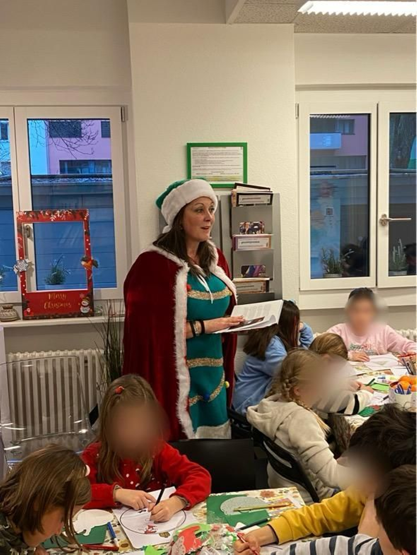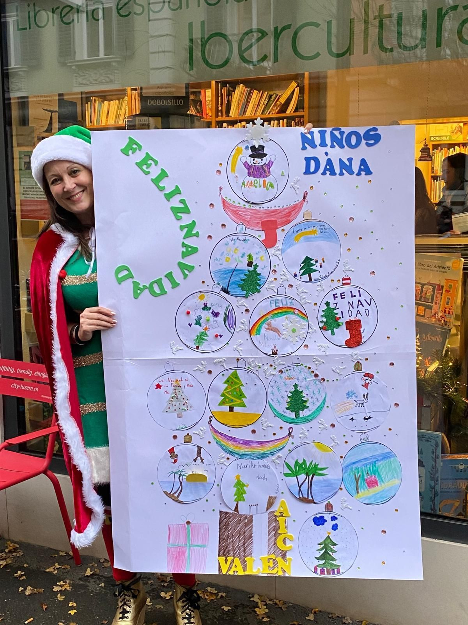 El taller, con el aforo completo, logró lo que pocos eventos culturales consiguen: unir generaciones en torno a la literatura infantil. En esta ocasión, tan especial, participaron numerosos niños de las aulas ALCE de Milchbuck, Dietikon y Lucerna, acompañados por su profesora Mar y sus padres. Tal fue la acogida que muchos de los padres, debido a la falta de espacio, tuvieron que esperar fuera, mientras los pequeños disfrutaban de una experiencia mágica y creativa. Durante el taller, los niños crearon sus propias postales navideñas y ángeles, además de colaborar en la realización de una gigante postal navideña cargada de cariño y buenos deseos. Esta especial obra de arte colectiva viajará hasta Valencia con el propósito de arrancar una sonrisa a tantos niños y niñas a quienes la terrible DANA les ha arrebatado tanto.
