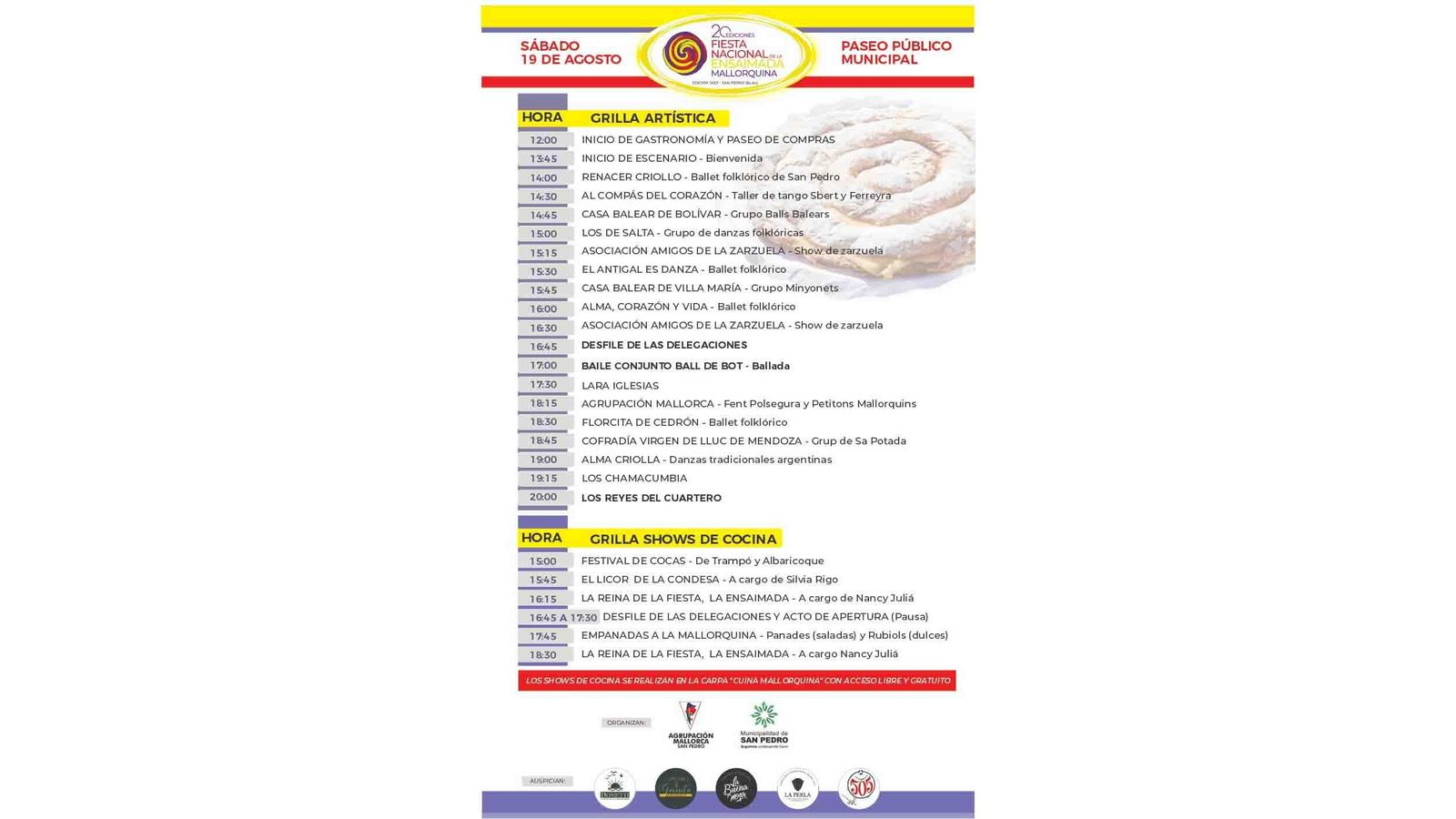 Los días 19, 20 y 21 de agosto se celebró en San Pedro, provincia de Buenos Aires, la edición número 20 de esta gran celebración de raíces hispano-argentinas: la Fiesta Nacional de la Ensaimada Mallorquina de producción sampedrina. La organización estuvo a cargo de la Agrupación Mallorca San Pedro y la Municipalidad de la ciudad, con el auspicio de las cinco confiterías que acompañan cada año, y la colaboración de una infinidad de firmas comerciales y empresariales de la ciudad.