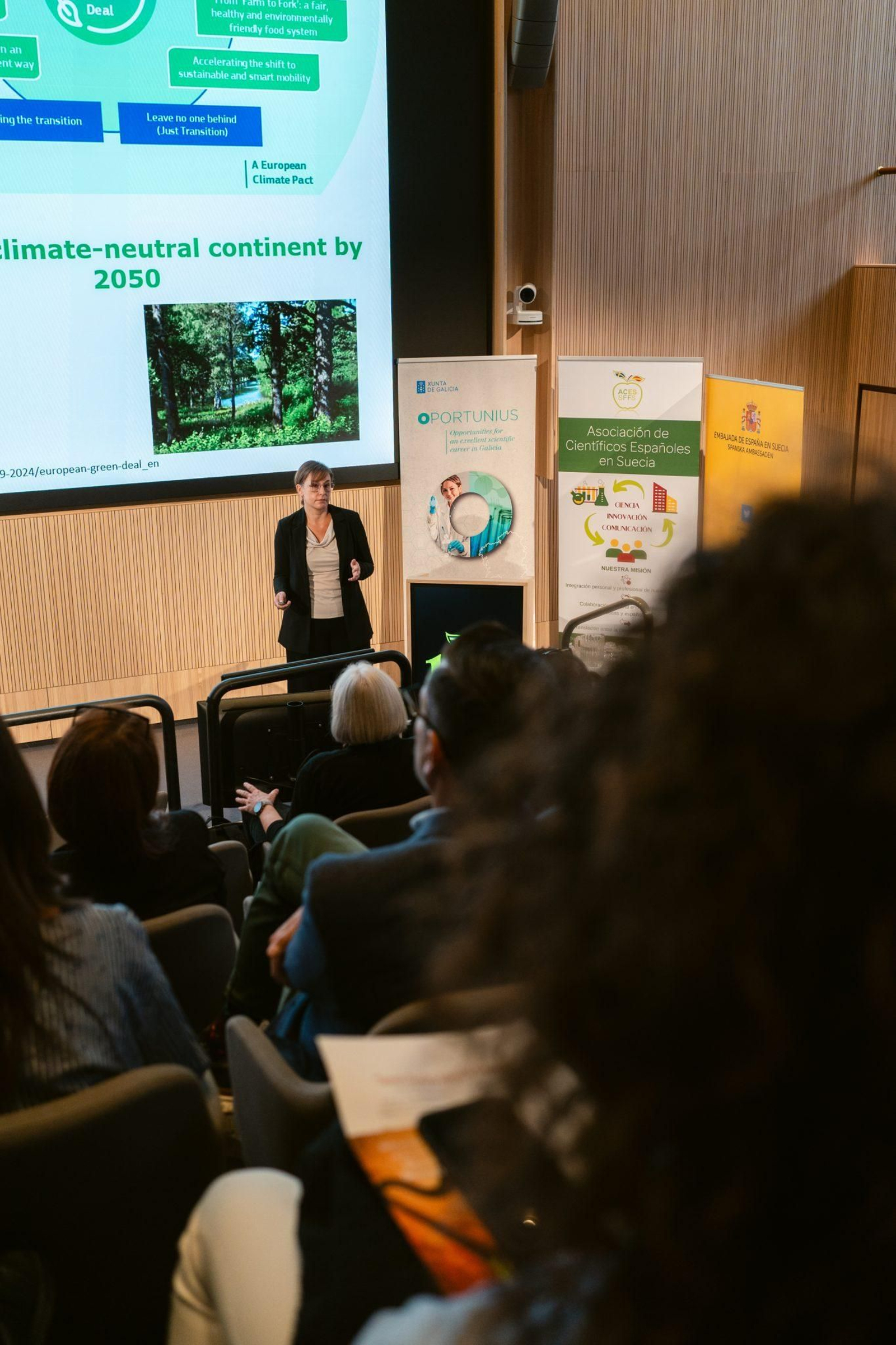 Al día siguiente, el sábado 14 de septiembre se celebró un simposio en el Instituto Cervantes de Estocolmo inaugurado por su nuevo director, Javier Galván, y el nuevo embajador de España en Suecia, Luis Cuesta. En la cita participaron más de cincuenta participantes, entre los que destacaba Manuel Azcona, director de comunicación de la Fundación Ramón Areces y sobre todo, la presencia de Eva Ortega Paíno, Secretaria General de Investigación del Ministerio de Ciencia, Innovación y Universidades, antigua vicepresidenta y pieza clave en la historia de ACES. Eva habló de su trayectoria personal como investigadora en Suecia y retornada a España, así como de las estrategias actuales para impulsar la ciencia en España.