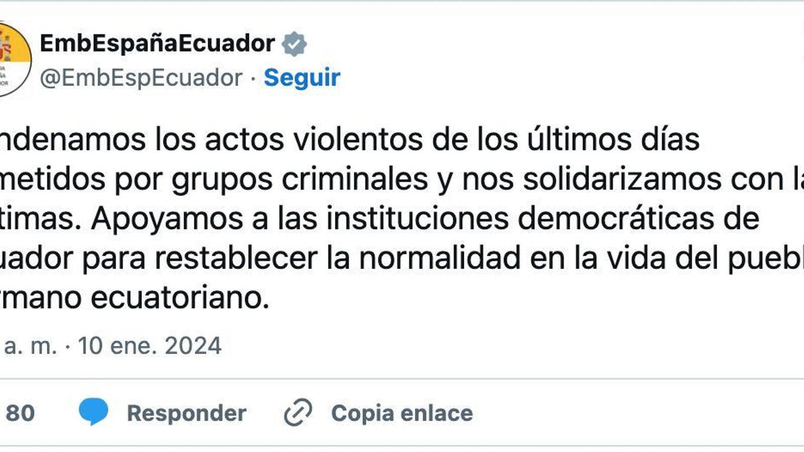 Un apoyo unánime y sin ambajes a Ecuador, decenas de países y entre ellos España han condenado "los actos violentos de los últimos días cometidos por grupos criminales y nos solidarizamos con las víctimas" y han mostrado su apoyo a las instituciones.