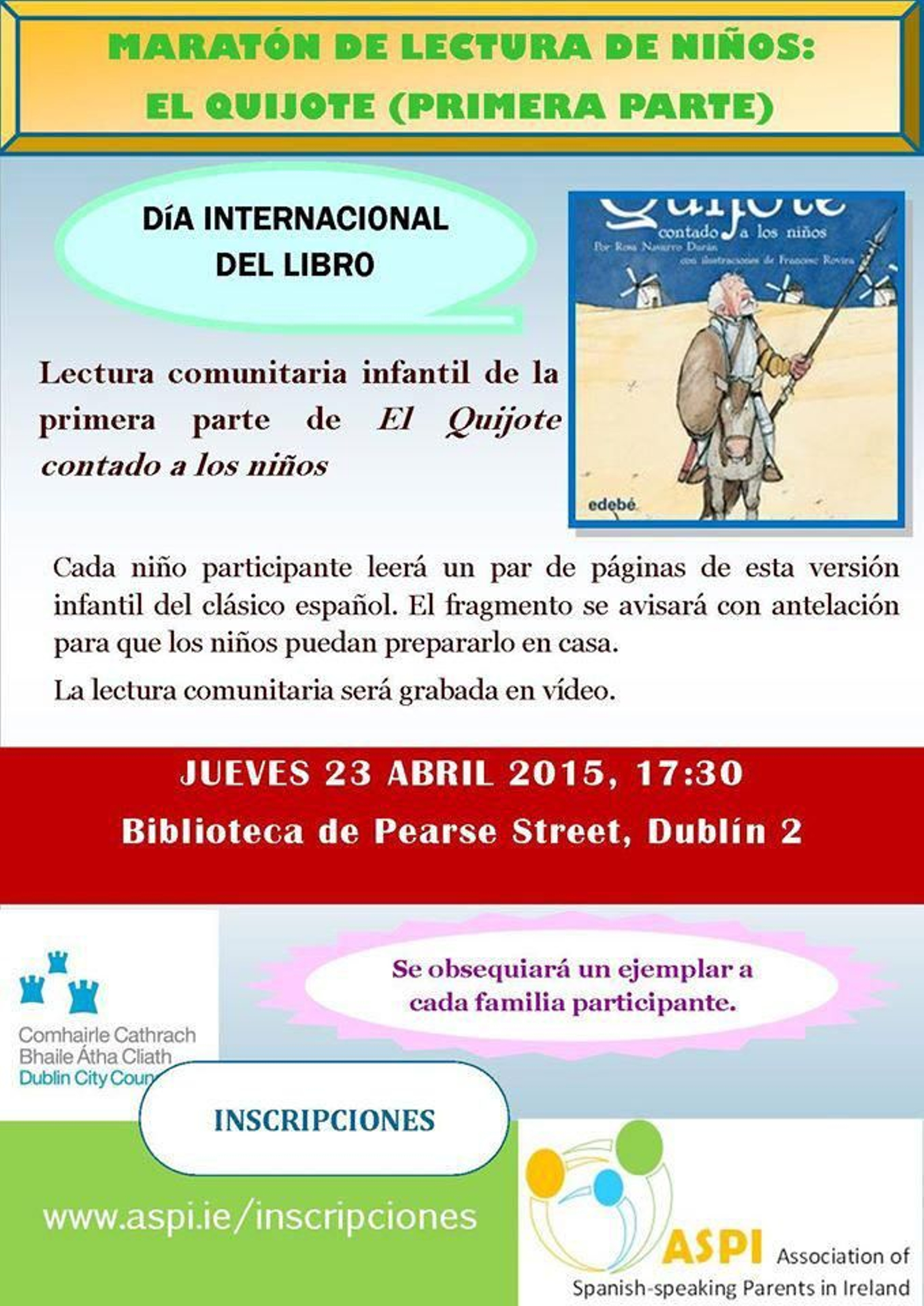 Los niños de la colectividad española residente en Irlanda están invitados a descubrir a uno de los personajes míticos de la literatura española: Don Quijote. El próximo jueves, 23 de abril, coincidiendo con el Día Internacional del Libro, ASPI, la Asociación de Padres de Familia de origen español de Irlanda convoca a sus socios a asistir a una "lectura comunitaria" de El Quijote.