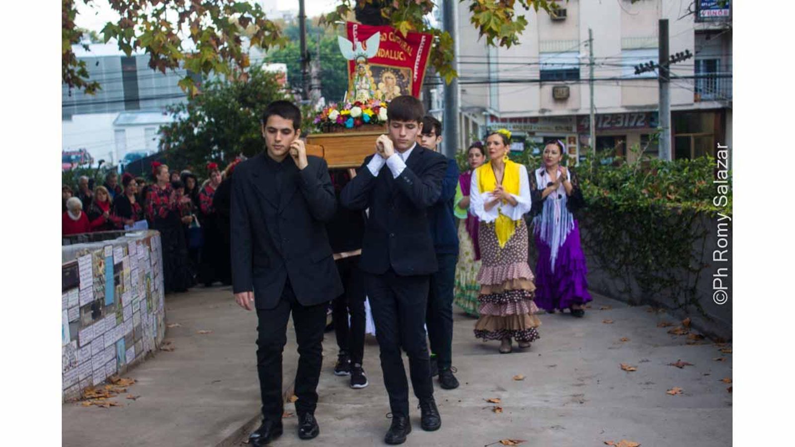 Las ofrendas fueron llevadas hacia el altar por un grupo de jóvenes de ascendencia andaluza, quienes al final de la ceremonia fueron los encargados de llevar en andas a la imagen de la Virgen del Rocío por las rampas que circundan a la gruta y llevan al templo superior.