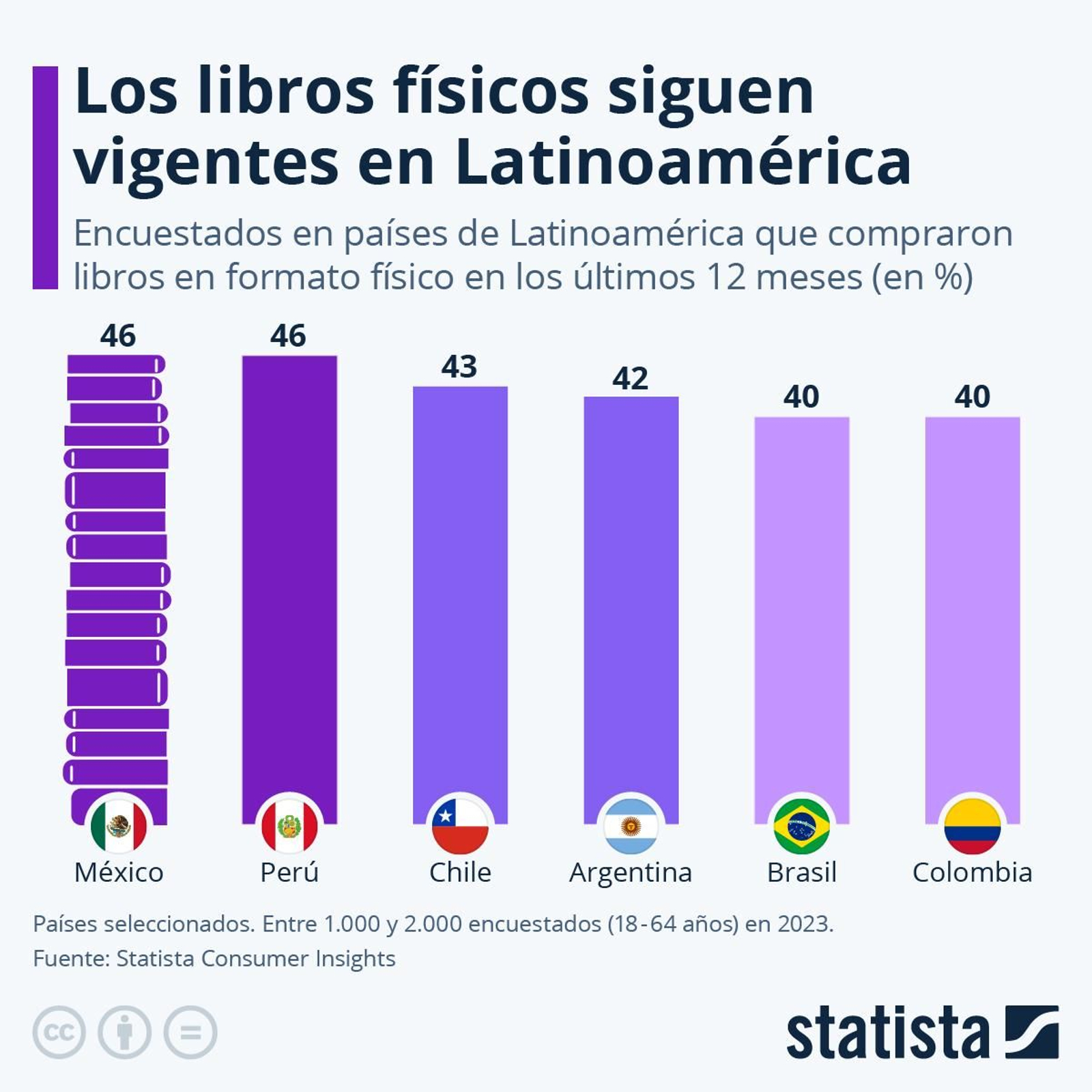 Según la macroencuesta Statista Consumer Insights, la compra de libros impresos triunfa en Hispanoamérica. En México y Perú, el 46% de los encuestados compraron, al menos, un libro durante el año anterior a la realización de la encuesta. Les sigue Chile, con un 43%, Argentina con el 42 %, y finalmente Brasil y Colombia con el 40%.