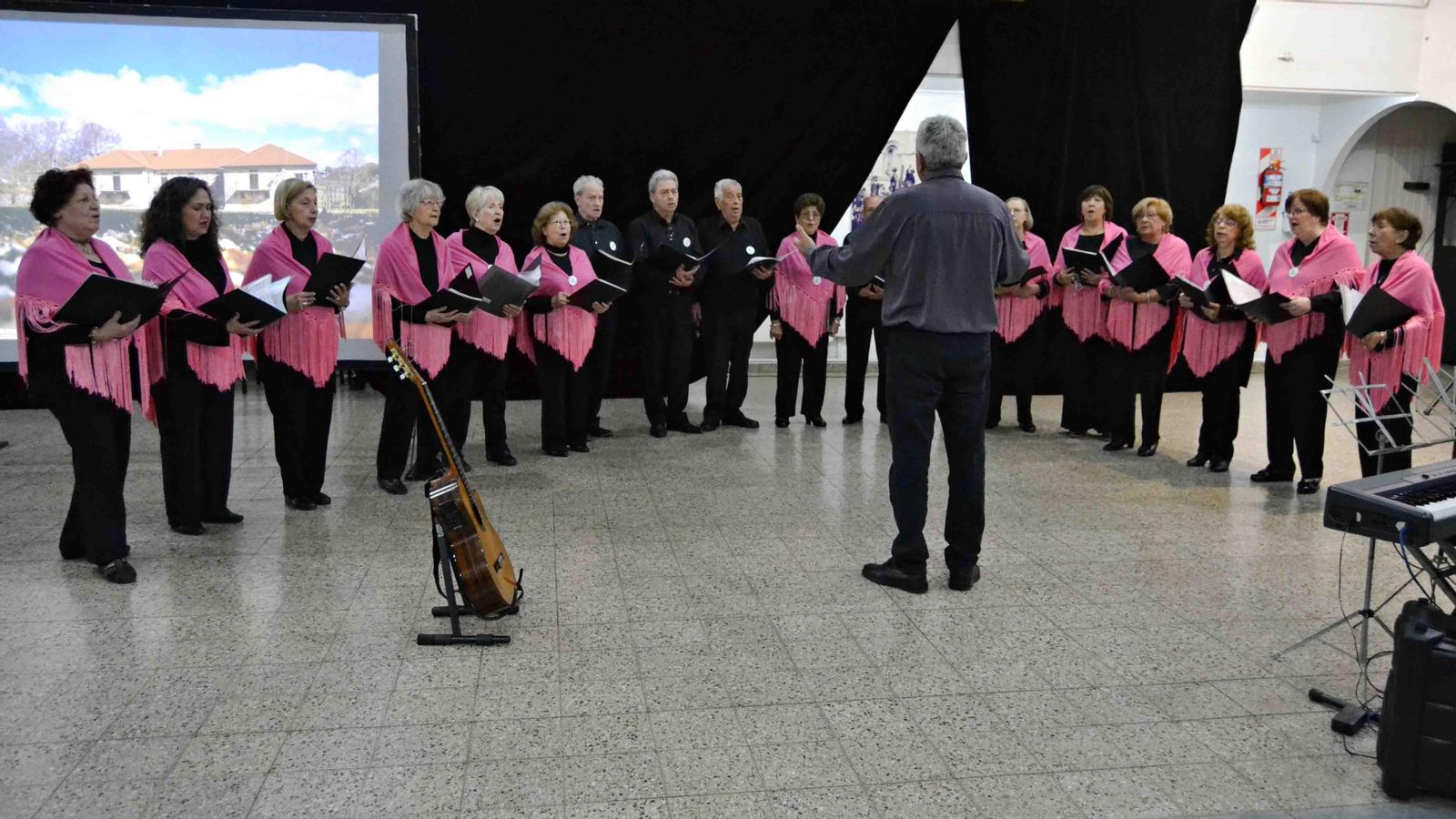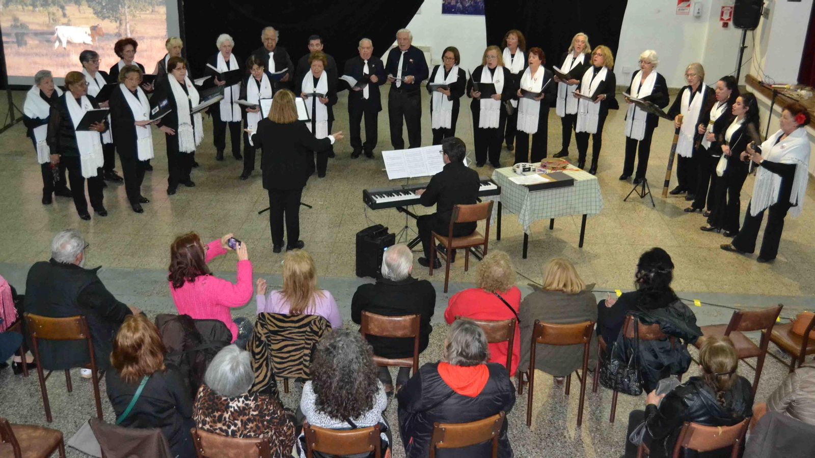 El Centro Andalucía abrió el evento cantando “Dame la mano”, “Malagueñas”, “Villancicos” y Sevillanas” mientras en la pantalla se emitían imágenes de Andalucía, lo que se repitió con cada coro con imágenes de la comunidad que representan.