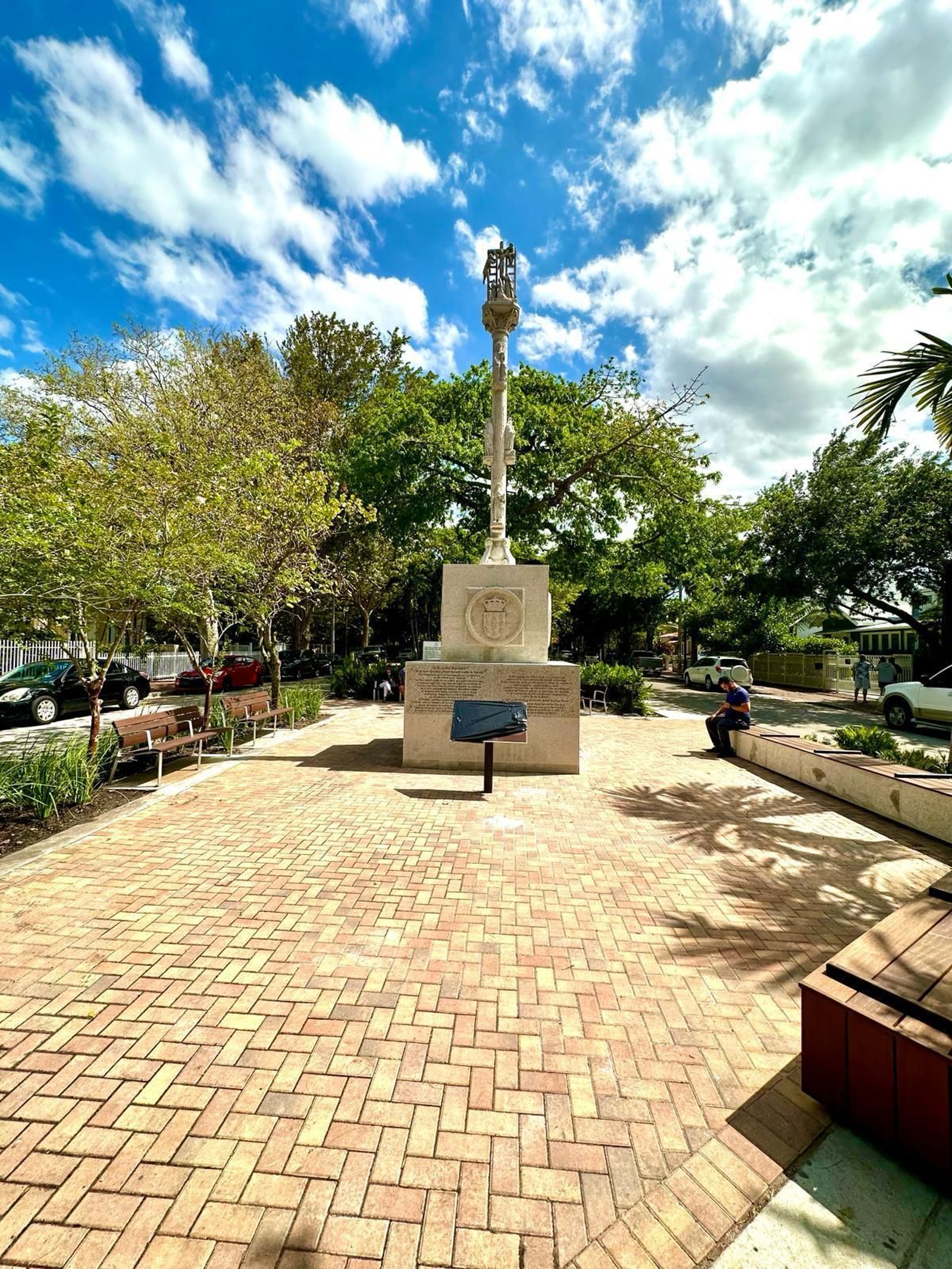 En el capitel están esculpidos cuatro ángeles que sostienen la cruz. El fuste tiene un diámetro de 25 centímetros y en él están tallados los mapas de Galicia, Cuba y La Florida además, contiene las figuras del Peregrino Xacobeo, Juan Ponce de León, La Virgen de la Caridad del Cobre y Santiago Apóstol. En el pedestal hay labradas varias conchas, símbolo del Camino de Santiago y en el dado están esculpidos los escudos de Galicia, España, Estados Unidos y Miami.