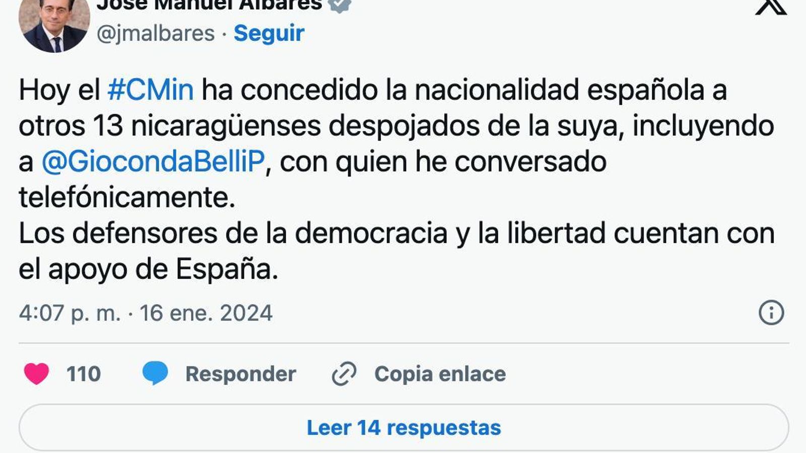 El Gobierno acaba de conceder la nacionalidad española a la última ganadora del Premio Reina Sofía de Poesía Iberoamericana, la poeta nicaragüense Gioconda Belli, y a otros doce exiliados de este país a los que el régimen de Daniel Ortega les retiró la ciudadanía por ser críticos con el gobierno.