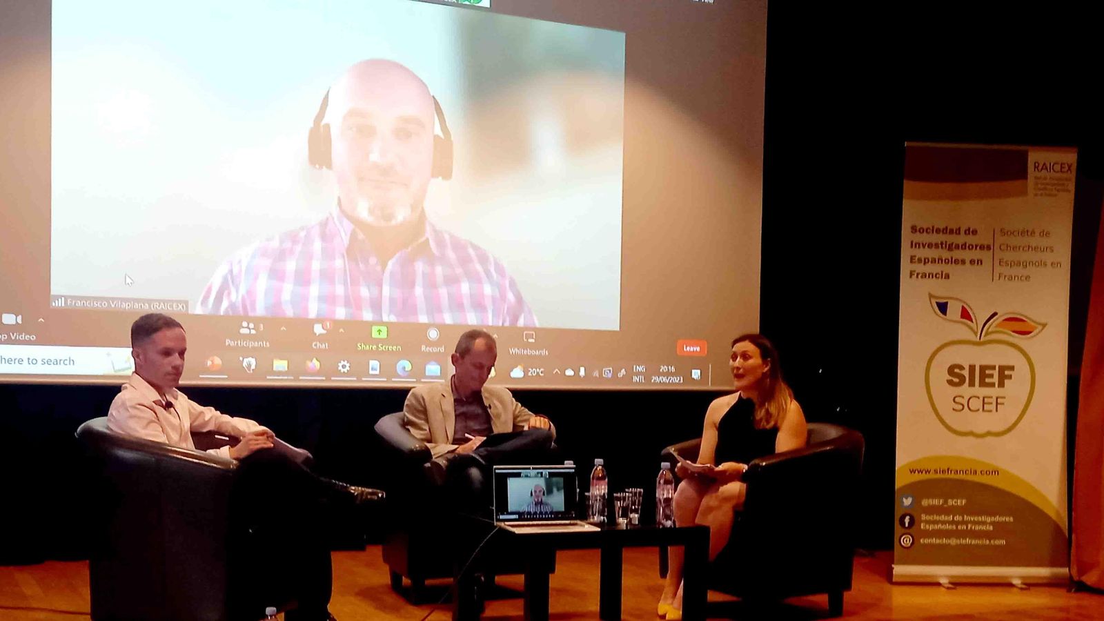 En el encuentro intervinieron Lourdes Mateos, presidenta del SIEF Francia, Justo Zambrana, director del Colegio de España, Carlos Pascual, vicepresidente del SIEF, Adrián Villalba miembro de SIEF y por videoconferencia participó Francisco Vilaplana, presidente de la Red de Cientificos Españoles en el Exterior (RAICEX).