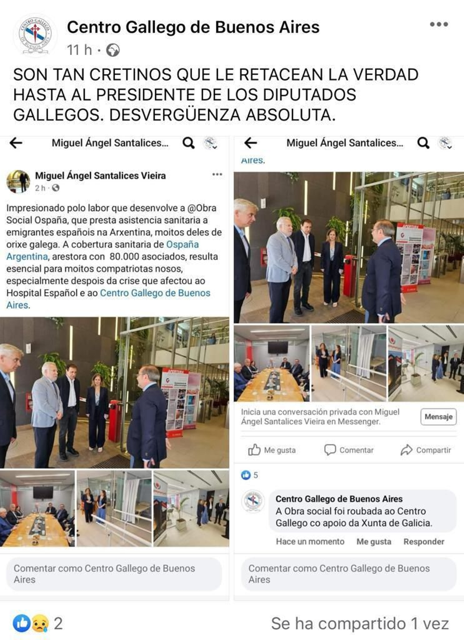 Declaraciones que no han sentado bien a los representantes del Centro Gallego de Buenos Aires, que sostienen que la obra social "fue robada" al Centro Gallego de Buenos Aires.