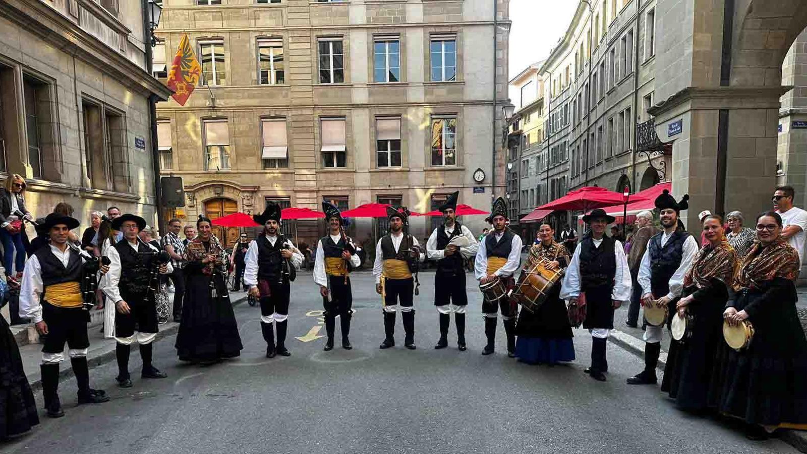 El grupo de música de A Irmandade Galega na Suiza, que cuenta con 50 años de historia y cuya presidenta, Noemí Figuerola Mera, continúa con el compromiso de difundir y promocionar Galicia en Ginebra, participó en la investidura del alcalde gallego orgulloso de sus raíces. Las gaitas, los trajes y Galicia como bandera llenaron las calles más emblemáticas de la ciudad representando una parte importante del trabajo altruista que, en este caso, un grupo de jóvenes continúa realizando para mantener latente, en un país que también consideran suyo, parte de su identidad. El gallego se escuchó por doquier en una ciudad cada día más multicultural donde tienen cabida las diferentes nacionalidades y así se demostró en esta celebración. A Irmandade Galega sonó alto y claro y puso a Galicia en el centro de atención de todos los asistentes que se entregaron en cuerpo y alma en cada una de sus piezas pidiendo más y más.