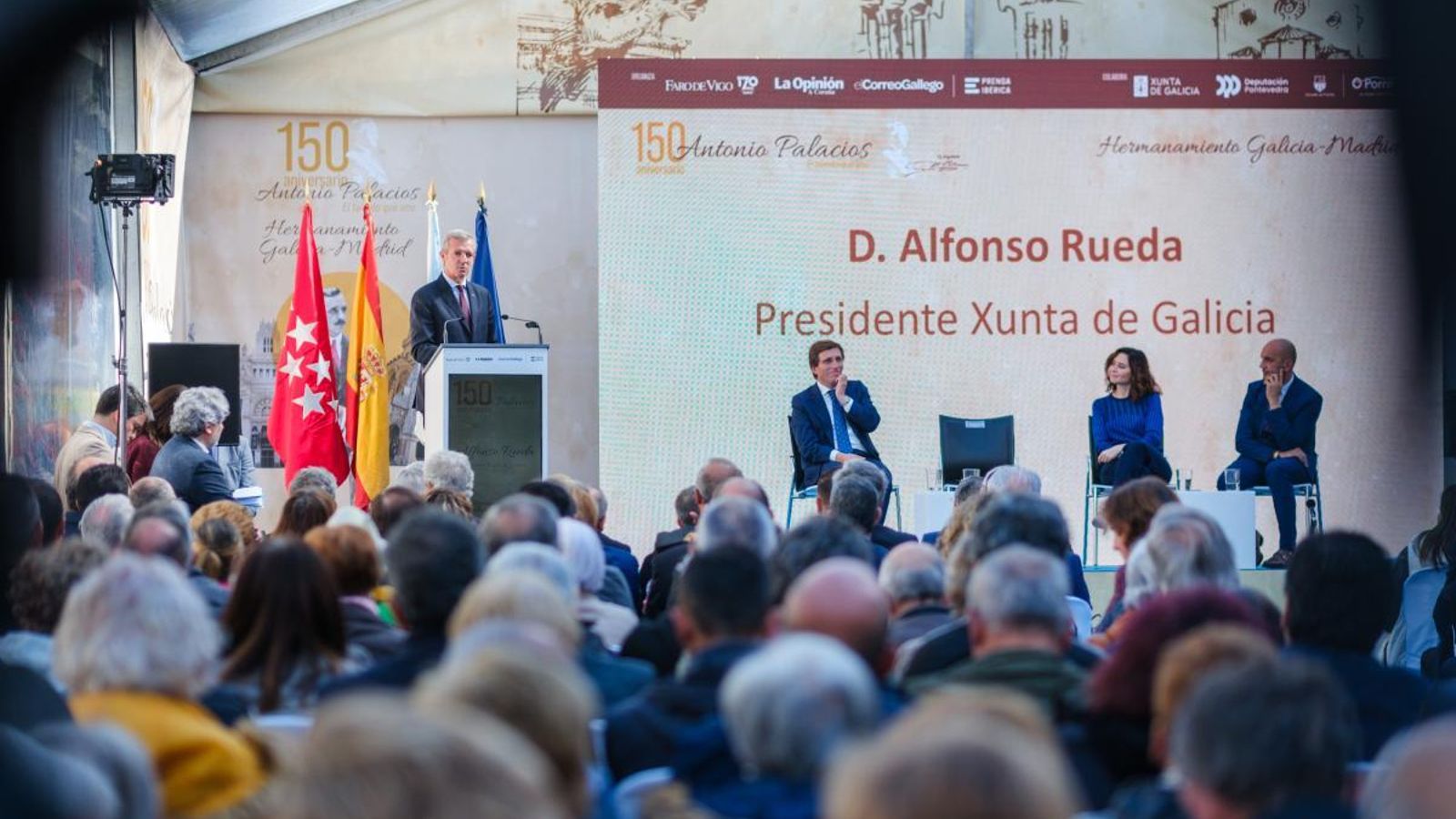 El presidente de la Xunta, Alfonso Rueda, situó al arquitecto Antonio Palacios como un gallego universal con un amplio legado tanto dentro como fuera de la comunidad. "Fue un magnífico embajador de su tierra y simboliza la unión entre Galicia y Madrid", indicó.