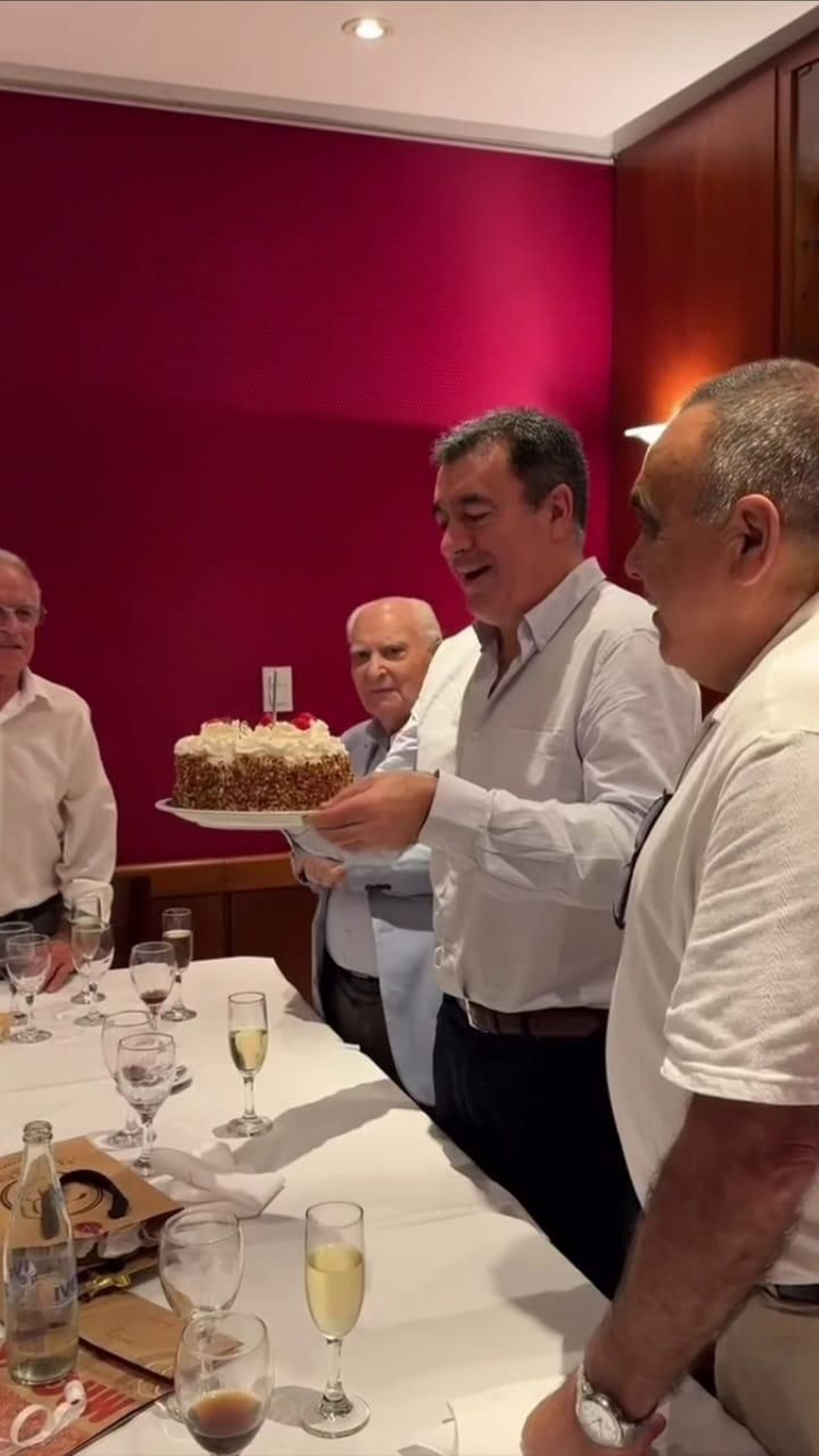 Al finalizar el almuerzo, una torta de cumpleaños, con su clásica vela encendida, lo sorprendió gratamente. Visiblemente emocionado, agradeció a los presentes, en especial a la institución y a su presidente, Don José González Costa, y expresó:
