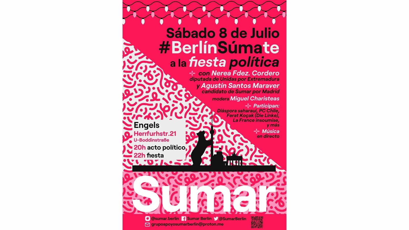 El próximo sábado 8 de julio a las 20:00 en el Café Engels (Herrfurthstr. 21, Berlin- Neukölln) Sumar Berlín organiza un evento político y festivo que contará con la presencia del Nº 2 de Sumar por Madrid, Agustín Santos Maraver, ex-embajador de España ante la ONU, y de la diputada regional de Unidas por Extremadura Nerea Fernández Cordero, ex-portavoz de Izquierda Unida Exterior